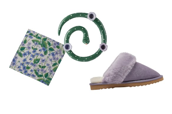 Where to buy: Bonnie & Neil “Lilas” napkins, $119 (set of four); Laetitia Rouget “Sneaky Dots” candle holder, $305; Super Ugg “Classic Scuff” slippers, $70.