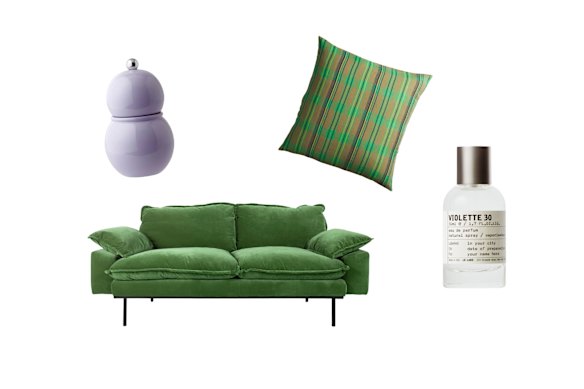 Where to buy: Addison Ross “Chubbie” pepper mill, $132; HKLiving “Retro” sofa, $4995; Sage x Clare “Nicolette” Euro pillowcase, $109 (set of two); Le Labo “Violette 30″ EDP, $362.