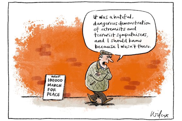 Despite the foul weather, nearly 100,000 protesters marched in support of the Palestinian cause, but police decided to block the exit on the north side and turn people around into the path of those approaching. They stood idly by as people were not clearly informed to what was happening. There were young children and people in wheelchairs on the march, yet there was no attempt from the police to mitigate the risk of a crush. I’m very disappointed with the NSW police force. Kenny Macintyre, North Ryde