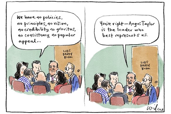 What a sobering and insightful article by Shaun Carney (“If Liberals think Angus Taylor will save them they’re in for a shock”, February 12). It should be compulsory reading for all members of the Liberal Party. Introspection is very hard indeed, but absolutely necessary to understand the mistakes of the past and of the present, as so eloquently explained by Carney. The fact of the matter is that irrespective of who is leader, the public has lost confidence that the opposition could form a credible government. That was the outcome of the election in May 2025. And, as Carney has written, that confidence has even eroded more so. Dennis Bluth, Cammeray