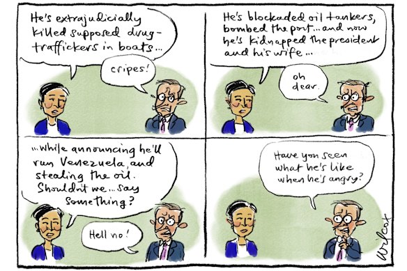 Human rights barrister Geoffrey Robertson writes that because Maduro didn’t opt out of the International Criminal Court he might have a legal case against Trump (“This is a warning to all world leaders who antagonise Trump”, January 5). Even if this is true, Trump would take no notice. As his capture of the Venezuelan president demonstrates, he has no respect for any law. Australia is still entangled with the US hoping that somehow the Democrats can make a comeback. One thing is clear: Trump will not go quietly now that he has control of the courts, the Congress and the army. We ignore his hunger for power at our peril. Our voting system protects our democracy, but our politics are definitely not bulletproof. Many think it was Peter Dutton’s similarity to Trump that turned the electorate against him. But while Sussan Ley tries to drag the Coalition back to the centre, the hard right of the party thinks they can make Trump-style politics work here. Could they be right? Gary Barnes, Mosman