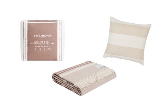 Where to buy: KEY PIECE The “Ultimate Dream” quilt (from $1000), featuring Sheridan’s custom comfort clip system; Country Road x Waverley Mills “Moya” merino wool throw, $399; Linen House European pillowcase, $75.