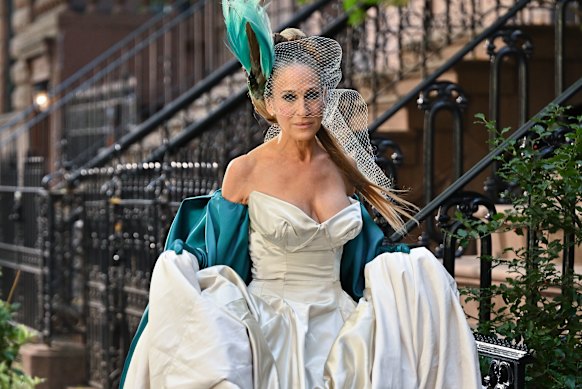 All eyes were on an older and wiser Carrie when she stepped out in the same gown in the sequel series, And Just Like That (above), this time en route to a much happier ever-after, courtesy of the Met Gala.